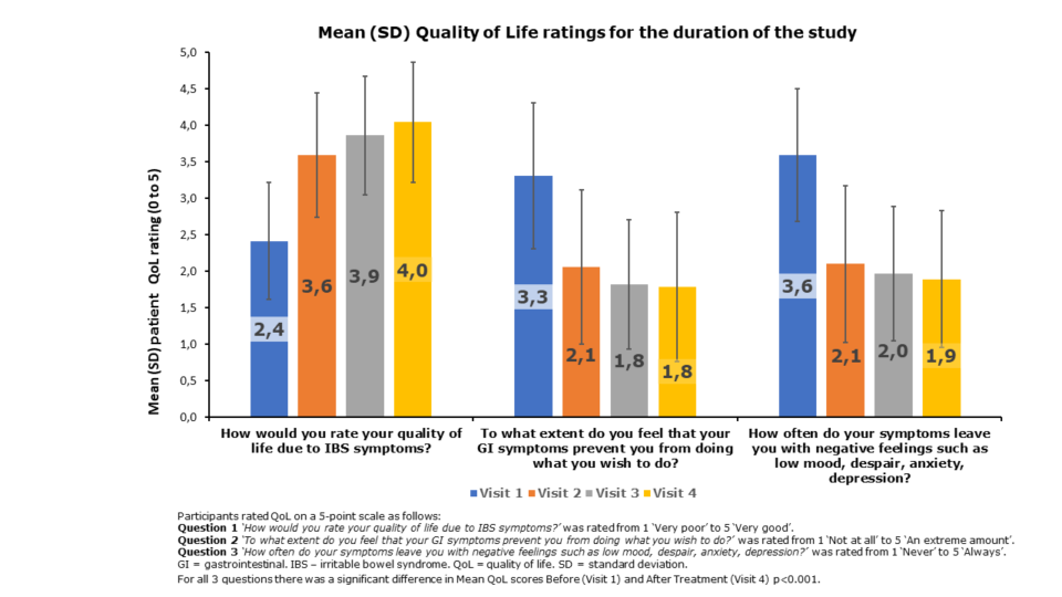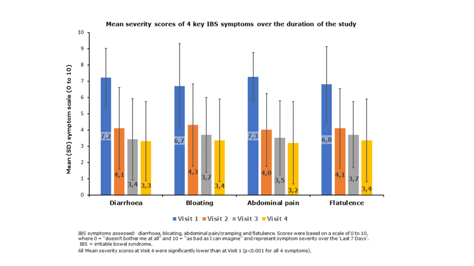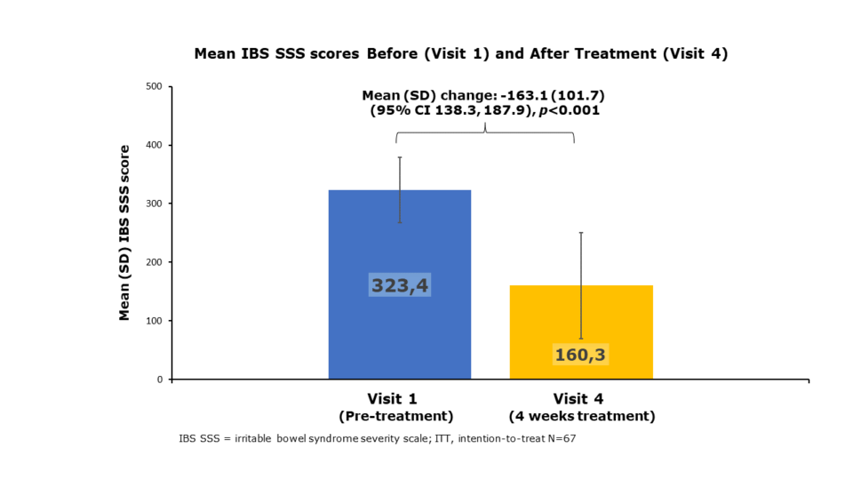 After 4 weeks of treatment, Mean IBS SSS score reduced from 323 to 160, a reduction of -163 representing a change from Severe to Mild IBS on the Francis Scale